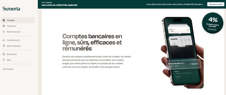 👉 En bref, Sumeria est une néobanque pour les adeptes du 100% mobile. Elle facilite les paiements entre proches et les cagnottes à partager. C'est désormais également une vraie banque en ligne avec toute la gamme de produits.
