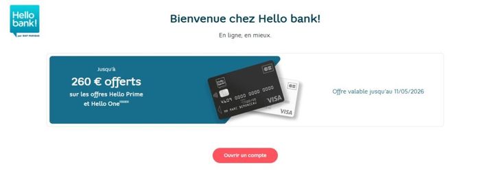 - Prime de bienvenue jusqu'à 260€ avec Hello One ou Hello Prime (jusqu'au 11/05/2026). Offre soumise à conditions.